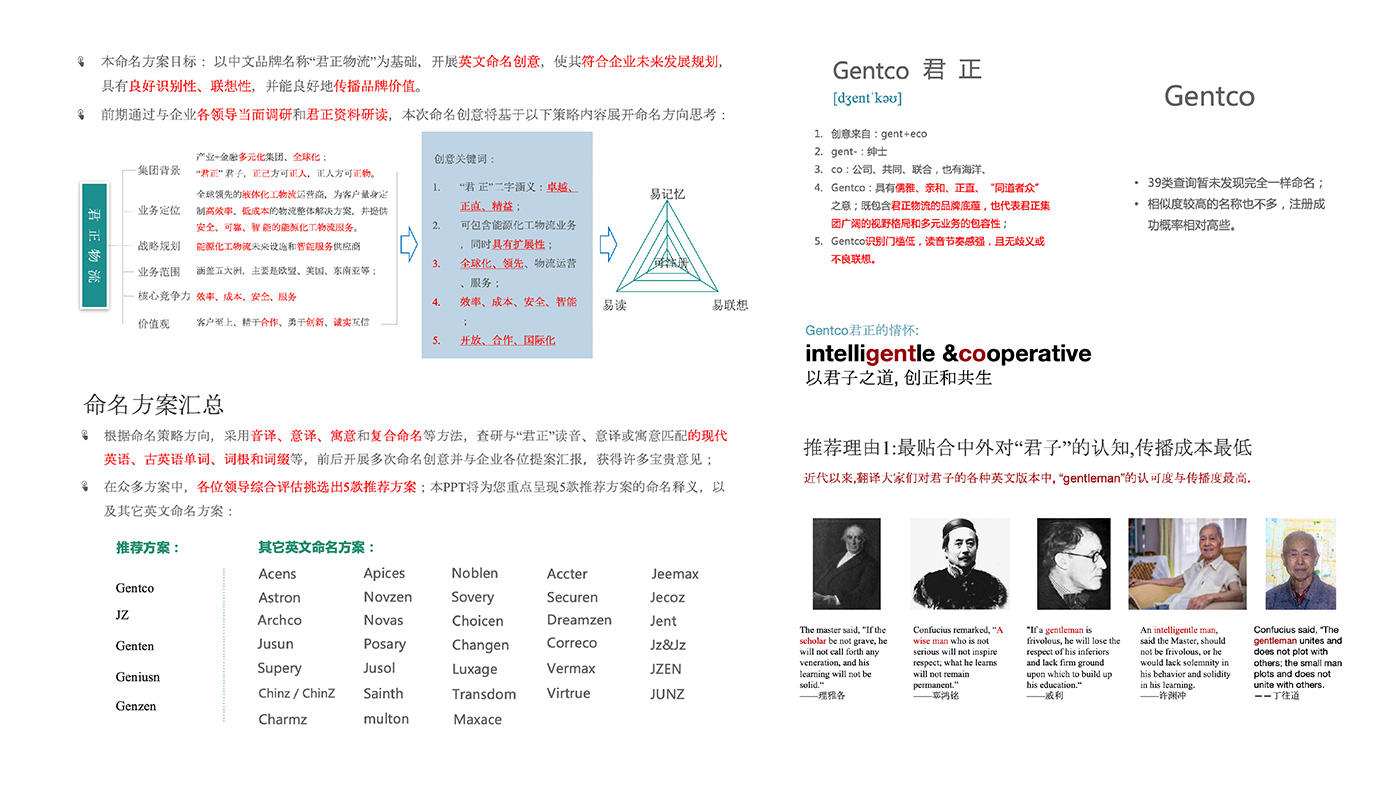 深入調研,了解到君正物流采用高端的進口車為客戶提供了快捷可靠的物流服務。提供的“Gentco ”這一英文命名創意具有儒雅、親和、正直、“同道者眾"之意;既包含君正物流的品牌底蘊,也代表君正集團廣闊的視野格局和多元業務的包容性,同時兼顧提高注冊成功率;品牌標志設計也考慮到了君正物流國際化、正直、安全、效率等品牌個性;從而為君正物流品牌構建了一個開放、和諧而延展性強的品牌家族體系。