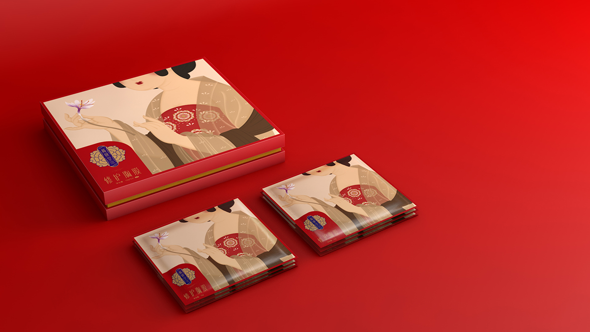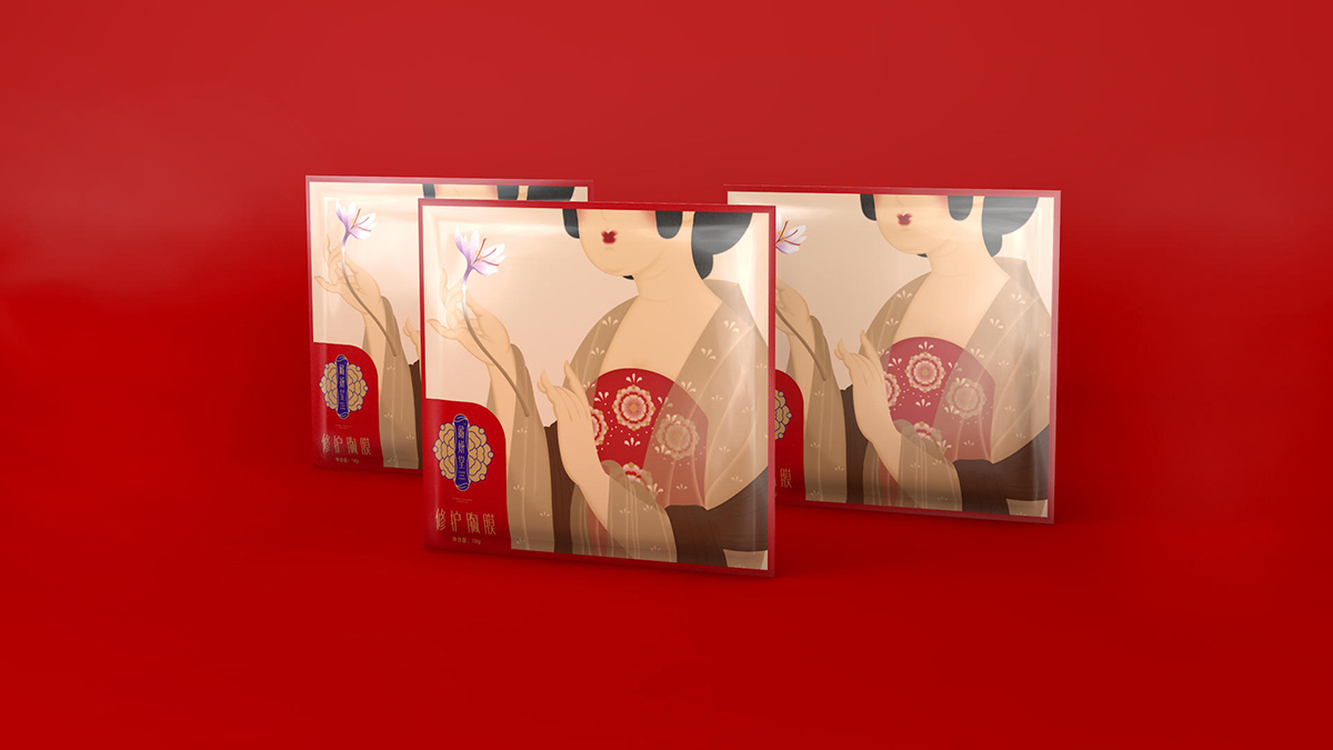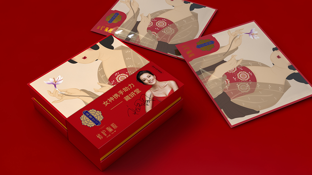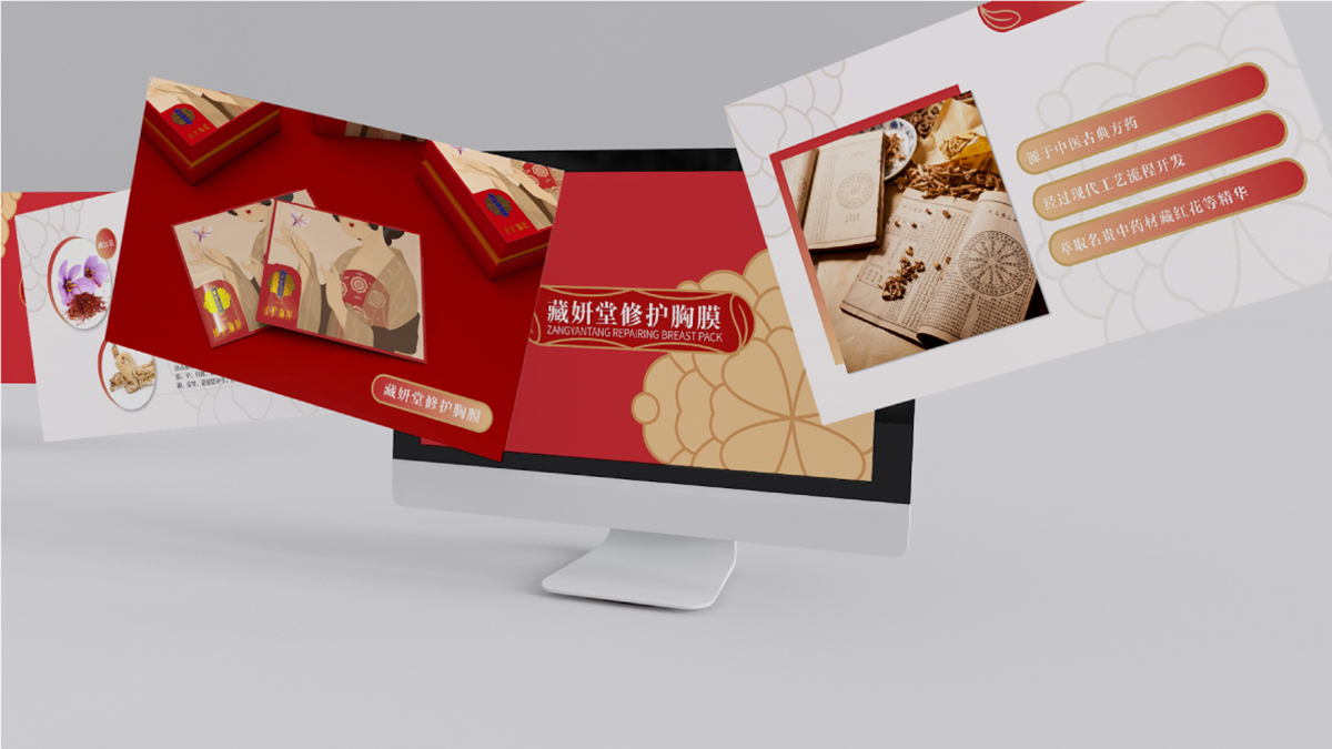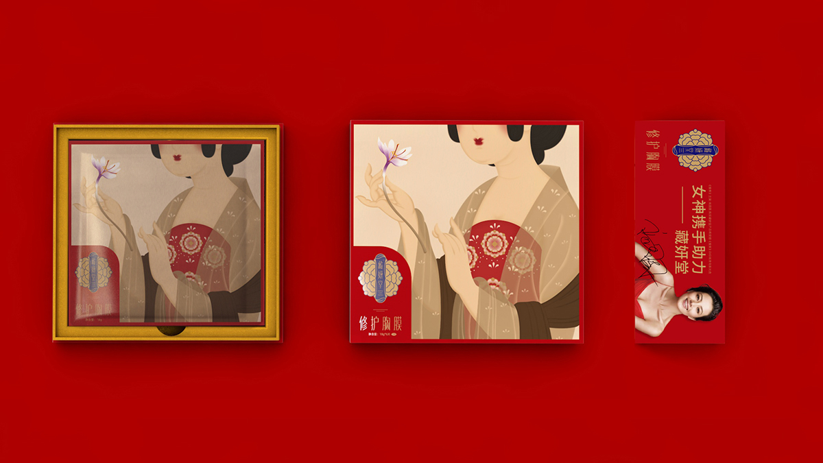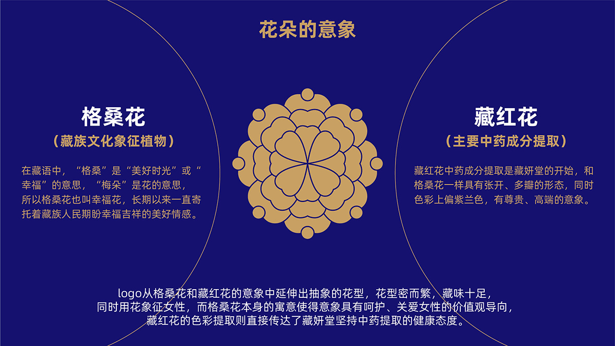 LOGO從格桑華和藏紅花的意向中延伸出抽象的花型,花型蜜而繁,藏味十足,同時用花象征女性,而格?;ū旧淼脑⒁馐沟靡庀缶哂泻亲o、關愛女性的價值觀導向,藏紅花的色彩提取則直接傳達了藏妍堂堅持中藥提取的健康態度。