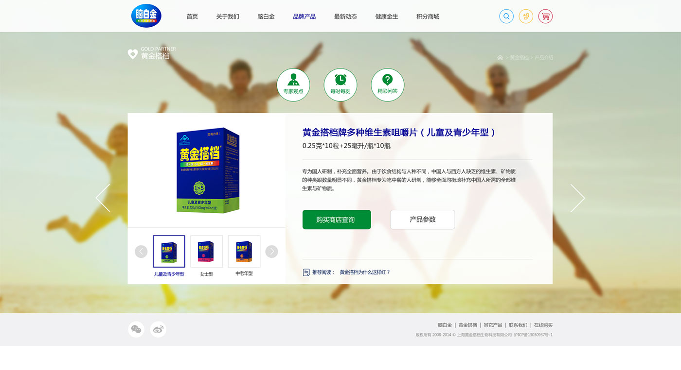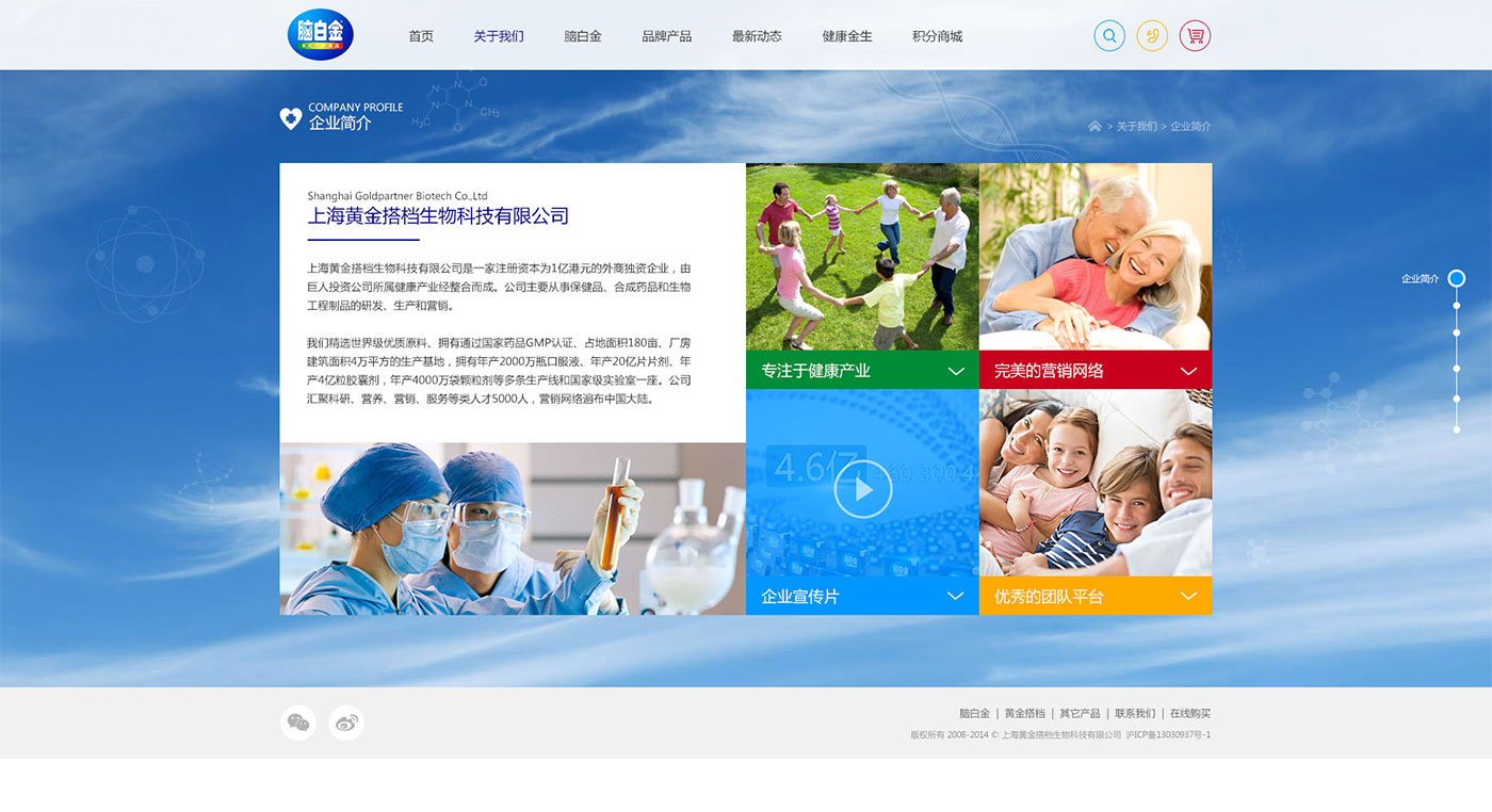 上海黃金搭檔生物科技有限公司網站建設,是一家注冊資本為1億港元的外商獨資企業,由巨人集團所屬健康產業經整合而成。公司擁有一座國家級實驗室、多條生產線;公司產品精選優質原料、生產車間空氣凈化達10萬級;營銷網絡遍布中國大陸,是目前中國規模較大、網絡較廣、實力較強的健康品企業之一。 公司一直致力于傳播禮孝以及家文化,倡導健康年輕態。主打產品“腦白金”、“黃金搭檔”旺銷多年,已成為老百姓表達愛心、孝心和保健自用的信賴品牌。長期以來,更是憑借產品協同增效的顯著特點和優質的售后服務,讓千萬用戶重返年輕、活出年輕態。